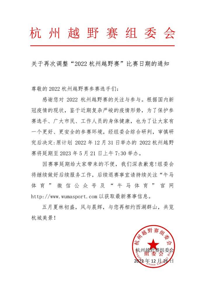 【延期公告】关于再次调整“2022杭州越野赛”比赛日期的通知