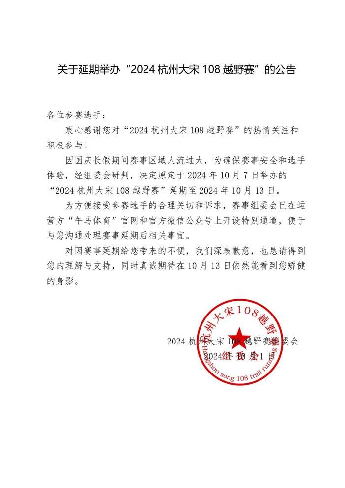 【延期公告】2024杭州大宋108越野赛